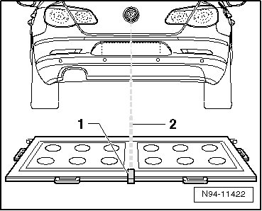 - Turn on the laser on the calibration tool - 1 - and align the entire calibration tool so that the laser beam - 2 - is pointed on the center of the rear lid above the VW logo.