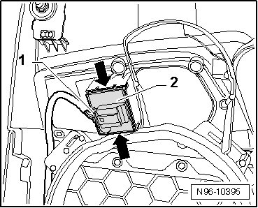 - Disengage the four retaining tabs - arrows - and remove the fuel filler/rear lid remote unlocking button - 2 - from the door trim.