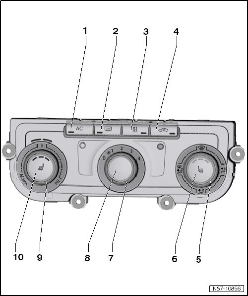 If the lamp in the AC button does not come after the button is pushed, there may be a fault in the control module. Call up the DTC memory using the Vehicle Diagnostic Tester. If the fault entry "A/C compressor first start not performed" is present, then is it necessary to perform a basic setting and an adaptation "A/C compressor first start" either in Guided Fault Finding or in Guided Functions.