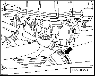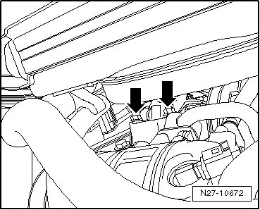 - Remove both bolts - arrows - and move the coolant pipes and the hose - 1 - upward so that there is enough space to remove the generator.