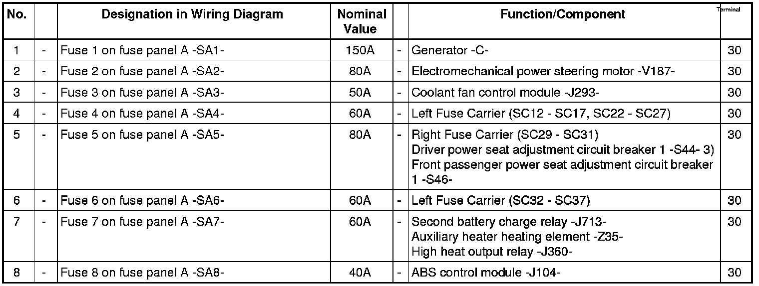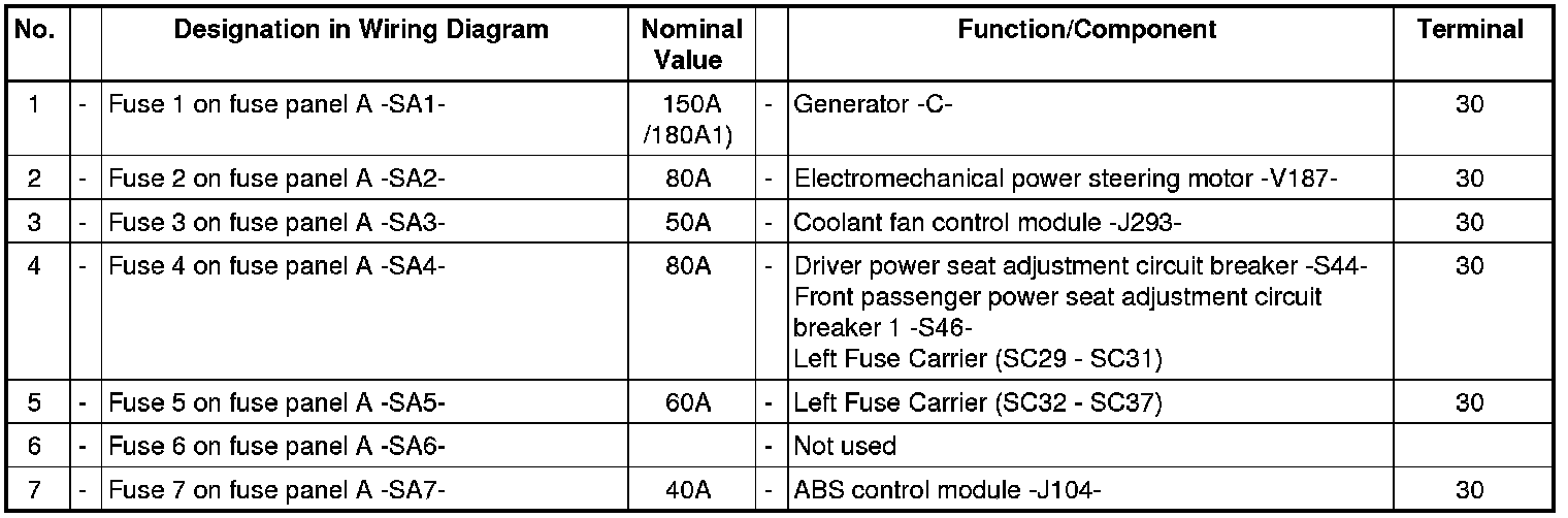 Fuse assignment on fuse panel A -SA- on