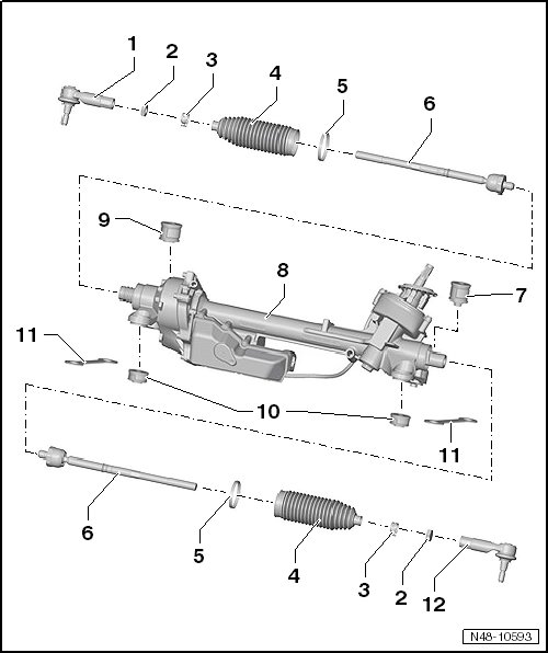 - With the vehicle raised (wheels hanging free), check the play by moving the tie rods and wheels. Play: Zero play