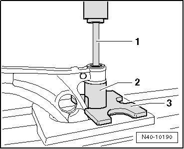 - Press in the bonded rubber bushing until the core - 1 - and the hole of the control arm - 2 - are at the same height.