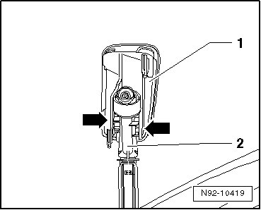- Unclip the cover cap - 1 - from the retainers on both sides - arrow - of the spray nozzle bracket - 2 -.
