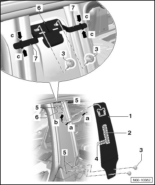 • Bracket - 6 - is installed and aligned. Refer to => [ B-Pillar Trim Mount ] B-Pillar Trim Mount
