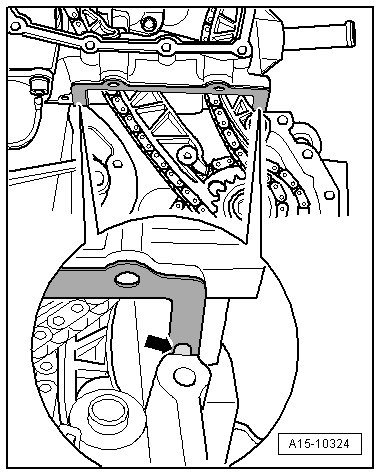 - Place a thin sealant bead - arrows - from below, in both corners between the cylinder head gasket and cylinder block so that the cylinder head gasket holes are filled.