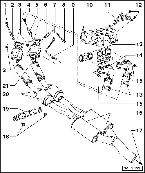 • See the note in => [ Exhaust Manifold, Front Exhaust Pipes with Catalytic Converters and Front Mufflers Overview ] Exhaust Manifold, Front Exhaust Pipes with Catalytic Converters and Front Mufflers Overview.
