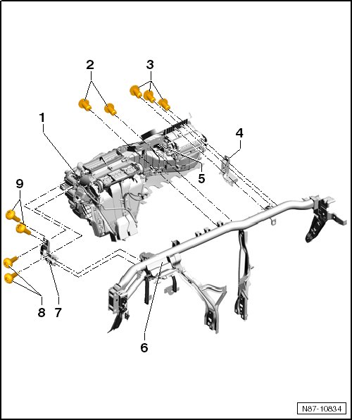 - Remove the bolts (9 Nm) - 2 - from the bracket - 5 - for the module carrier - 6 -.