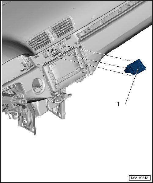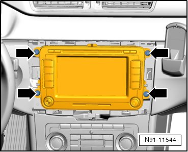 - Remove the bolts - arrows - from the Radio/Radio-Navigation system and remove the Radio/Radio-Navigation system about 5 cm from the instrument panel.
