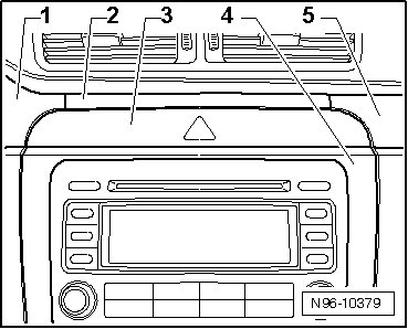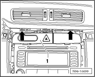 - Remove the bolts - arrows - and the console - 1 - with the emergency flasher switch from the instrument cluster. Be careful of the connected wires.