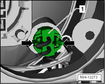 - Press both releases - arrows - and pull the bulb socket and parking lamp bulb - 1 - out of the reflector. Pay attention to the wires still connected.