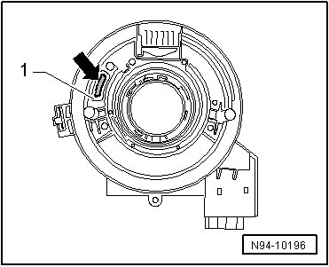 - Lift both retaining straps - arrows - on Airbag Spiral Spring/Return Spring With Slip Ring (F138) - 1 - slightly and pull off Airbag Spiral Spring/Return Spring With Slip Ring (F138) toward rear from steering column.