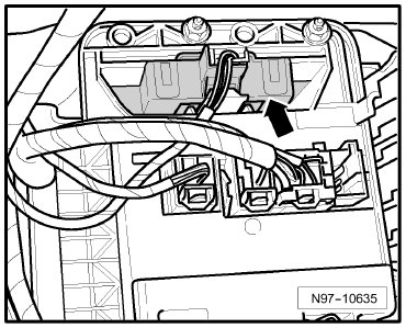 Below instrument panel, right, behind front passenger's airbag -Arrow-