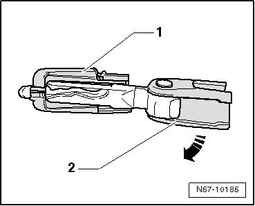 - Remove battery - 1 - in - direction of arrow - from lower part of remote control key - 2 -.