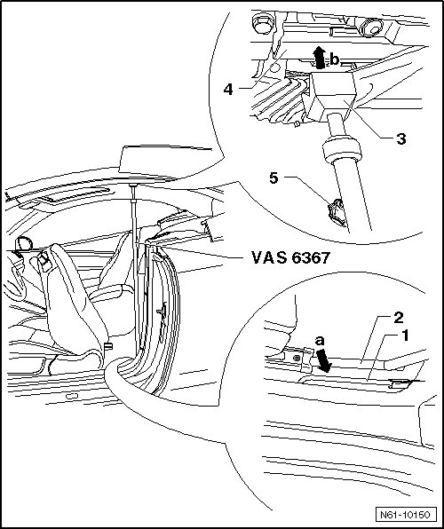 - Adjust guide rails according to front dimension - a - that was noted using Guide Rail Assembly Gauge (VAS 6370). Tighten the screw - 5 -.