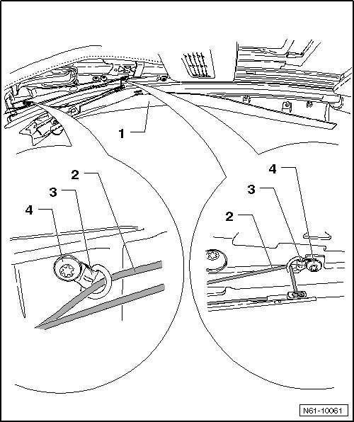 - Remove screws - 4 - on eyes - 3 - and allow roof pillar trim - 1 - to hang down on tensioning bands - 2 -.