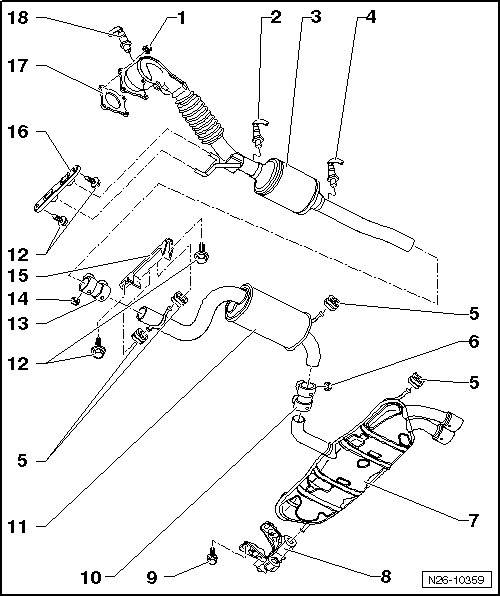 • After exhaust system repairs, make sure the exhaust system is not under stress and is far enough from the body. If necessary, loosen the clamping sleeve and align the muffler and exhaust pipe so that there is adequate distance to the body and that the weight is evenly distributed among the suspended mounts.