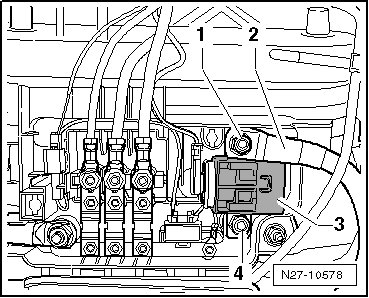 - Remove collar nut - 1 - (15 Nm) and remove B+ wire - 2 - from connection thread.