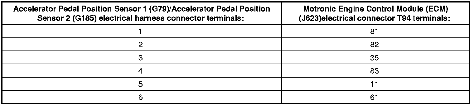 - Using a multimeter, check the Accelerator Pedal Position Sensor 1 (G79)/Accelerator Pedal Position Sensor 2 (G185) electrical harness connector terminals to the Motronic Engine Control Module (ECM) (J623) electrical connector T94 for an open circuit.