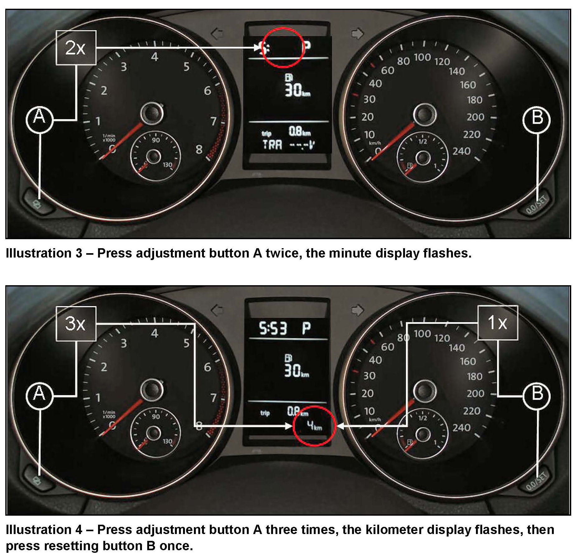 When pressing the button the first time the hour display flashes (illustration. 2) when pressing the second time the minute display flashes (illustration. 3) and when pressing the third time the kilometer display flashes (illustration 4)