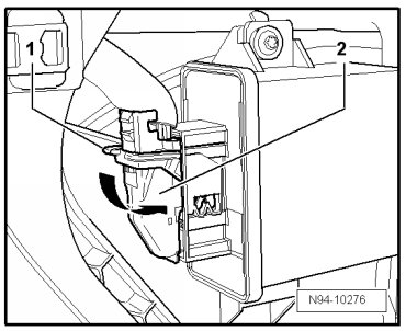 - Disengage securing bracket - 1 - in - direction of arrow - and disconnect harness connector - 2 - from Cornering lamp and headlamp range control module (J745).