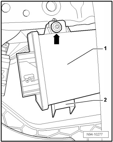 - Remove mounting bolt - arrow - and remove Cornering lamp and headlamp range control module - 1 - from bracket - 2 -.