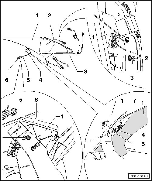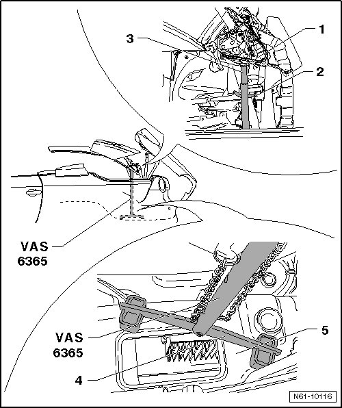 - Place the hinge supports (VAS 6365) in the mounting hole in the main hinge - 1 - and rotate the base - 4 - so that it is not positioned in the opening in the longitudinal.