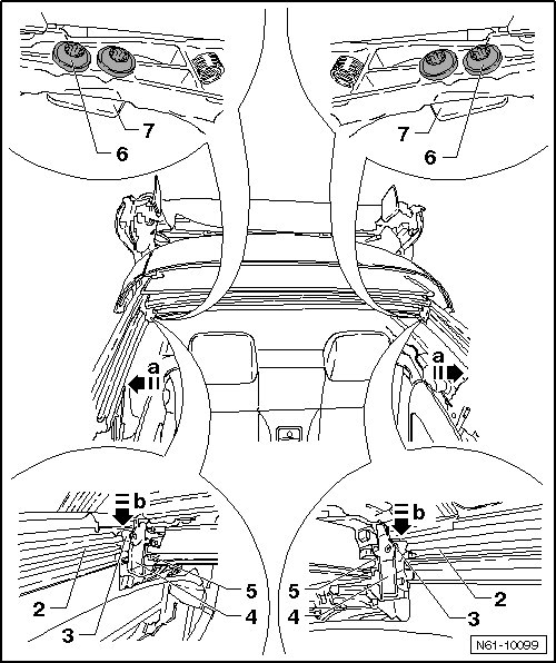 - Move the roof pillar toward the outside - arrow a - until the slider - 3 - in the slotted guide rail - 4 - can be guided over to front guide rails - 2 - without touching - arrow b -.