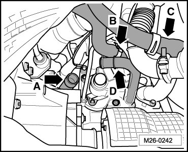 - Disconnect the coolant hoses from both connections - arrows A and D -.