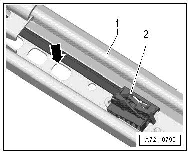 - Remove the slider - 1 - from the seat rail - 2 - toward the rear by tipping it slightly toward the tunnel.
