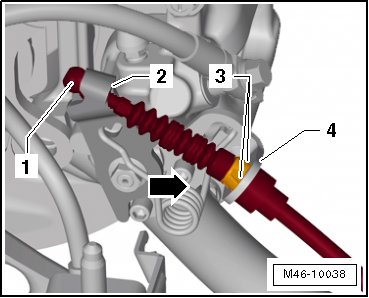 - Squeeze the tabs - 3 - and remove the parking brake cable - 1 - from the bracket - 4 - on the brake caliper.