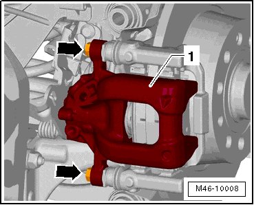 - Counter hold the guide bolt and remove the bolts - arrows - from the brake caliper - 1 -.