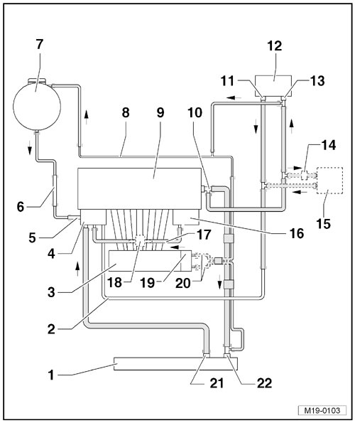 • Checking the coolant thermostat, see - item 17 - in Part 1 of the => [ Coolant Pump and Thermostat Overview ] Coolant Pump and Thermostat Overview.