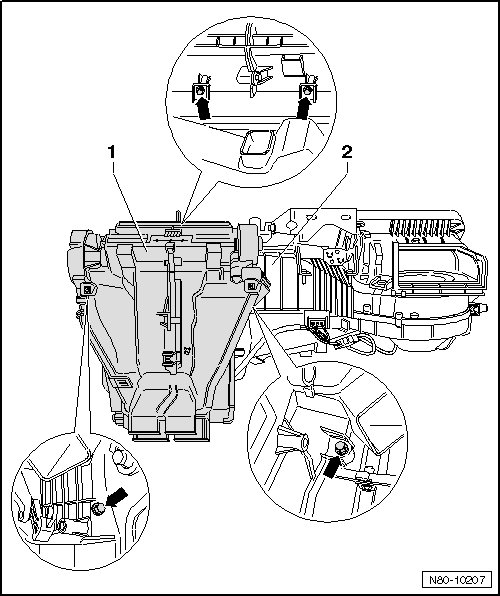 - Remove the air distribution housing - 1 - from the heater - 2 -.