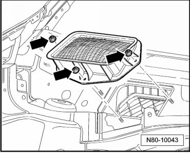 - Remove the flange nuts - arrows - (2.5 +/- 0.4 Nm) and the air grille.