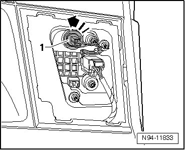 - Turn the bulb holder - 1 - for the right back-up lamp (M17) in - direction of arrow - and remove the bulb holder from the tail lamp assembly.
