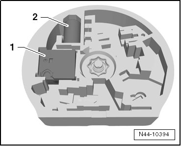 The wheel repair kit is located in the luggage compartment, where the spare tire would be stored if the vehicle was equipped with one. The kit contains a compressor - 1 - and a bottle of tire sealant - 2 -.