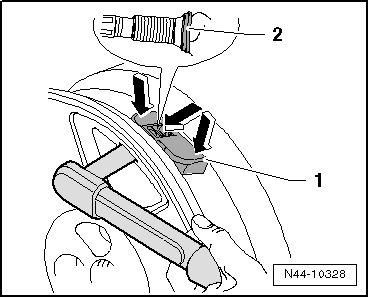 - Insert the tire pressure sensor - 2 - with new seal and sealing washer and press it on the spots marked with the - arrows - into the disc wheel (rim).