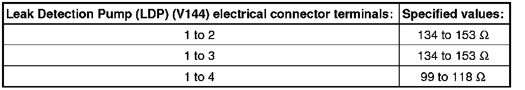 - Using a multimeter, check the Leak Detection Pump (LDP) (V144) for resistance as follows:
