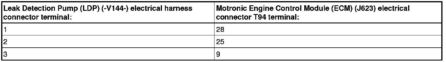 - Using a multimeter, check the Leak Detection Pump (LDP) (-V144-) electrical connector terminals to Engine Control Module (ECM) (J623) electrical connector terminals for an open circuit or high resistance. Refer to Wiring Diagrams for pin locations.