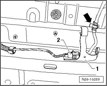 - Unclip the wire - arrow -, pull off the bracket - 1 - and disconnect the connector for oxygen sensor after three way catalytic converter (G130) - 2 -.