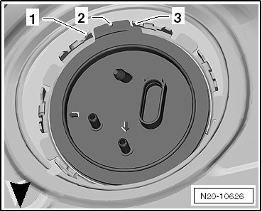 The tab - 2 - on the locking flange must lie between tabs - 1 and 3 - on the fuel tank.