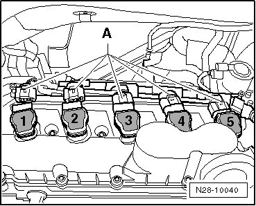 - Disconnect all the connectors - A - starting at ignition coil - 1 - and remove the ignition coils from the spark plug shaft.