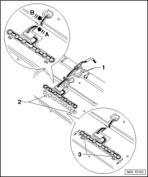- Press the wiring harness into the recess in the padding at the areas indicated by the - arrows A and B -.