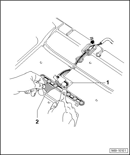 - Press wiring harness in positioning aid area - 1 - in rear padding channel.