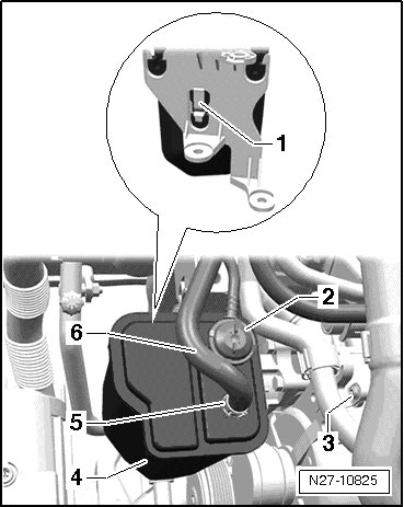 - Open the clamp - 5 - with the (V.A.G 1921) and remove the connecting hose - 6 - from the EVAP canister - 4 -.