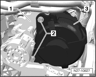 - Remove the generator - 1 - to the right in - direction of arrow - and out of the vehicle. At the same time move the loosened refrigerant lines - 2 - slightly to the side.