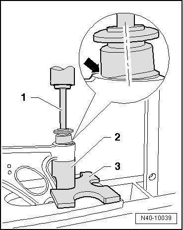 - Press in bonded rubber bushings as far until core - 1 - and hole of control arm - 2 - are at the same height.