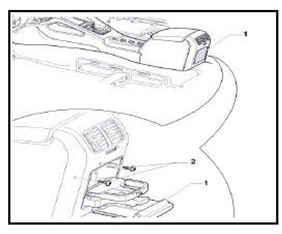 ^ Open rear cup holder (1) and remove two fasteners (2).