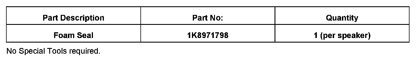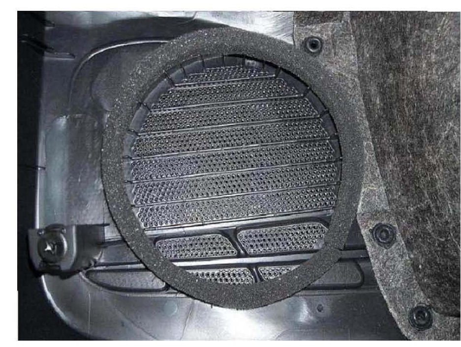 Ensure the foam seal is properly positioned and is producing a good seal between the door trim and speaker. The foam seal must be neatly attached to the outer surface of the tabs that form a circle around the speaker grille.